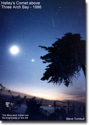 We must consider other vistas around Three Arch Bay, including those above our head. I came to the Bay in the 1960's. At that time, the surrounding areas of Mission Viejo, El Toro, Laguna Niguel and others were nonexistent. Three Arch Bay was surrounded by a pool of inky blackness at night, with only a very faint glow coming from the lights of Laguna, 4 miles north. The blazing constellations were our constant companions. We lived under a starry dome of treasure. The night sky above was truly a wonder to behold. A brilliant Milky Way ran up and over our heads like a river of Diamonds, shimmering with ghostly fire from horizon to horizon throughout the winter months. The farthest object away that you can see with the naked eye, the Andromeda Galaxy, would glow like soft cotton in the folds of Cassiopeia's dress. Comets, those mysterious periodic celestial visitors, would plunge into the inner solar system trailing long delicate tails of dust and gas to grace our skies. I loved to take pictures of them. (I was ill during the passage of Hale-Bopp and didn't get any photographs. If you have any photos of this famous visitor to Three Arch Bay, taken here in the Bay, I would love to see them. Contact me please!)